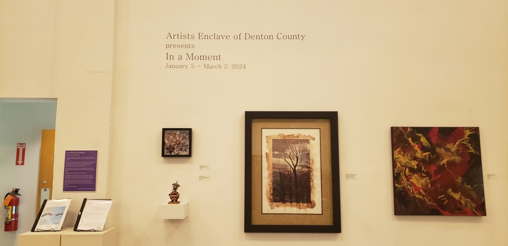 2024 In The Moment — a juried exhibition organized by the Artists Enclave of Denton. Exhibition location: Festival Hall, Patterson-Appleton Arts Center, Denton, Texas (January 5, 2024-March 2, 2024) (Title: Impending Doom; Size: 44″ x 34″)