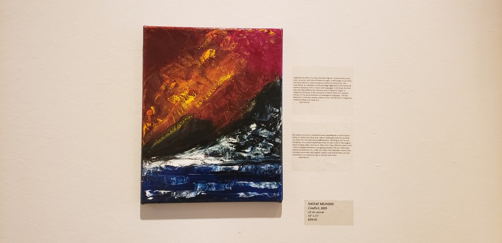 2014 A solo exhibition of thirty-three oil and watercolor paintings by Sadaf Munshi. The exhibition titled Islands of Serenity was organized and hosted by the Jammu & Kashmir Academy of Art, Culture and Languages in Srinagar (India). It was the first solo exhibition by a female artist of Kashmir, covered by all leading state newspapers and state television.